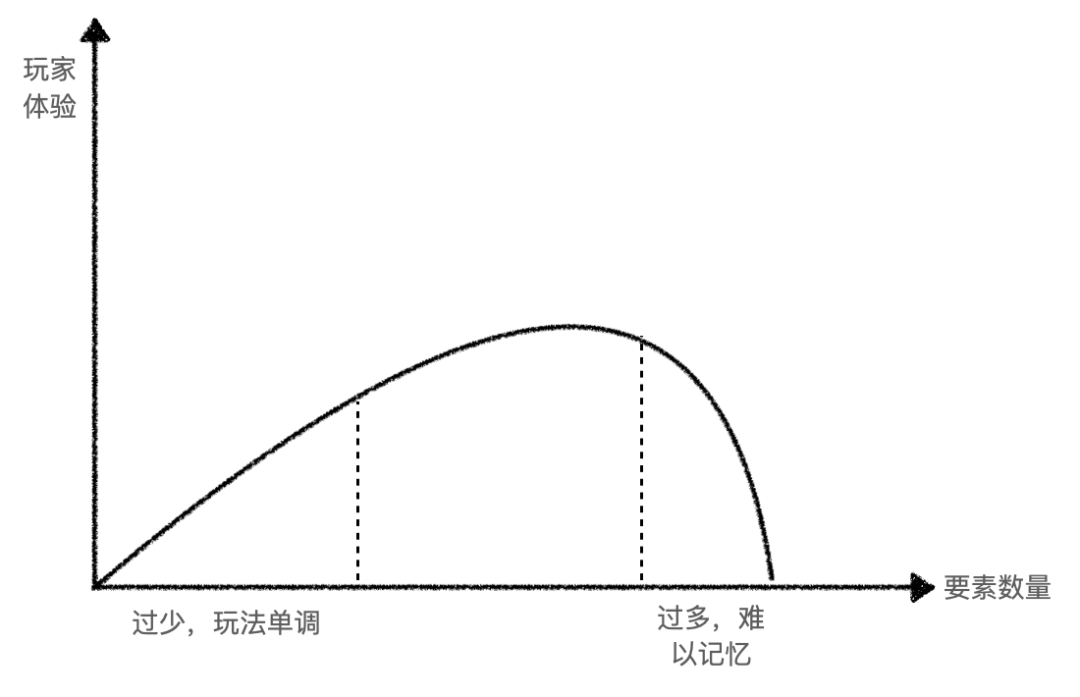 ⽽要素的数量也符合边际效益递减原则:要素过少意味着⼀个关卡内玩家需要进⾏重复的操作,那到关卡后期就会有疲惫与乏味感,很难推动情绪进⼊⾼潮;如果要素过多超过了玩家可以承受的范围,⼤家会觉得很沮丧因为⼈脑的内存是有限的,⼿忙脚乱且难以记忆只会让玩家觉得乱七⼋糟。