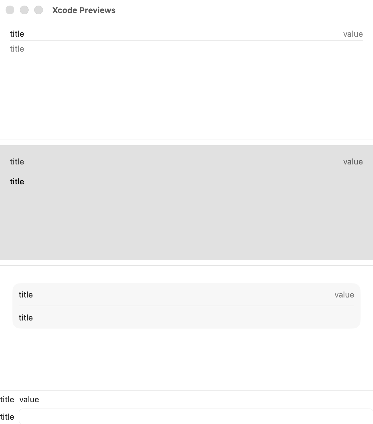 | struct FormVSList: View { @State private var enterText: String = "" var body: some View { VStack { List { LabeledContent("title", value: "value") TextField("title", text: $enterText) } Divider() List { LabeledContent("title", value: "value") TextField("title", text: $enterText) } .listStyle(.sidebar) Divider() Form { LabeledContent("title", value: "value") TextField("title", text: $enterText) }.formStyle(.grouped) Divider() Form { LabeledContent("title", value: "value") TextField("title", text: $enterText) } } .frame(height: 650) } }